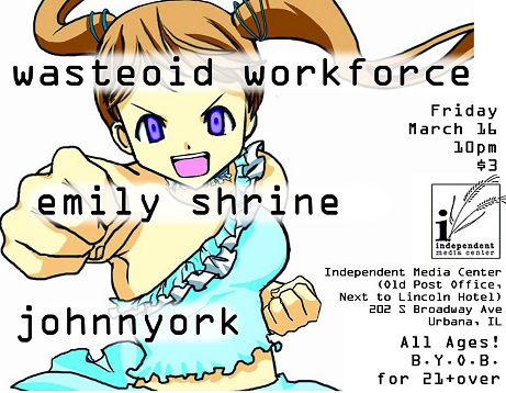 - Friday, 4/14/06, 7PM - IMC in Urbana, IL (Urbana Post Office) w/ kick-ass TBA's